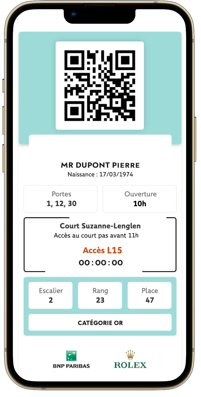 Le QR code et votre numéro de place s’affichent dans l’app. Présentez-les aux contrôles pour accéder au stade et au court indiqué. Bonne session !